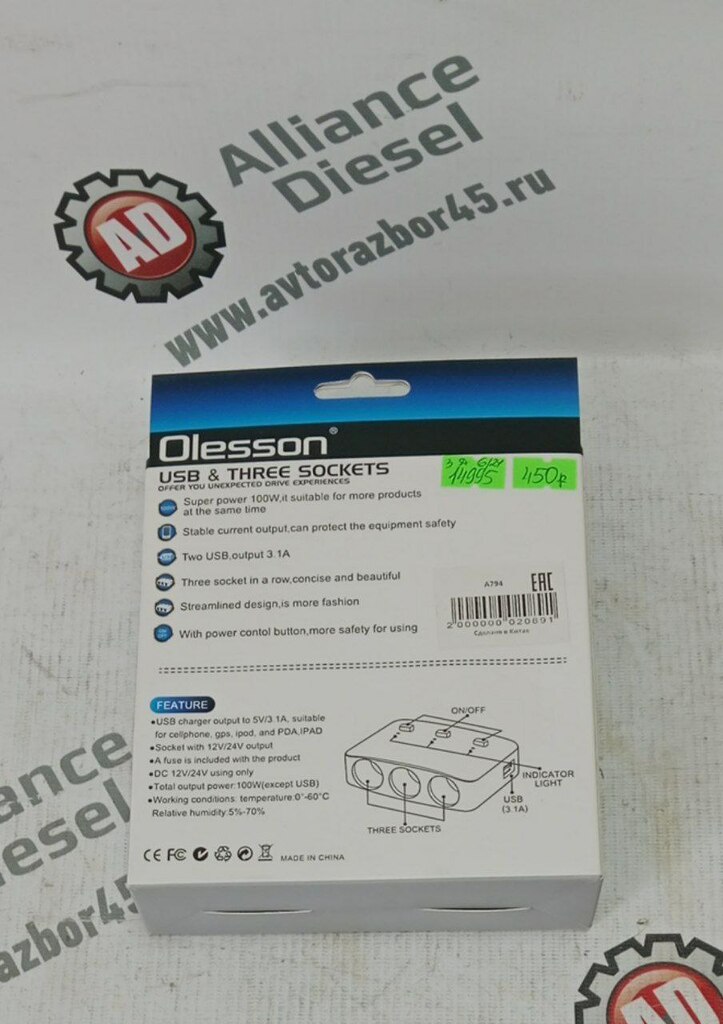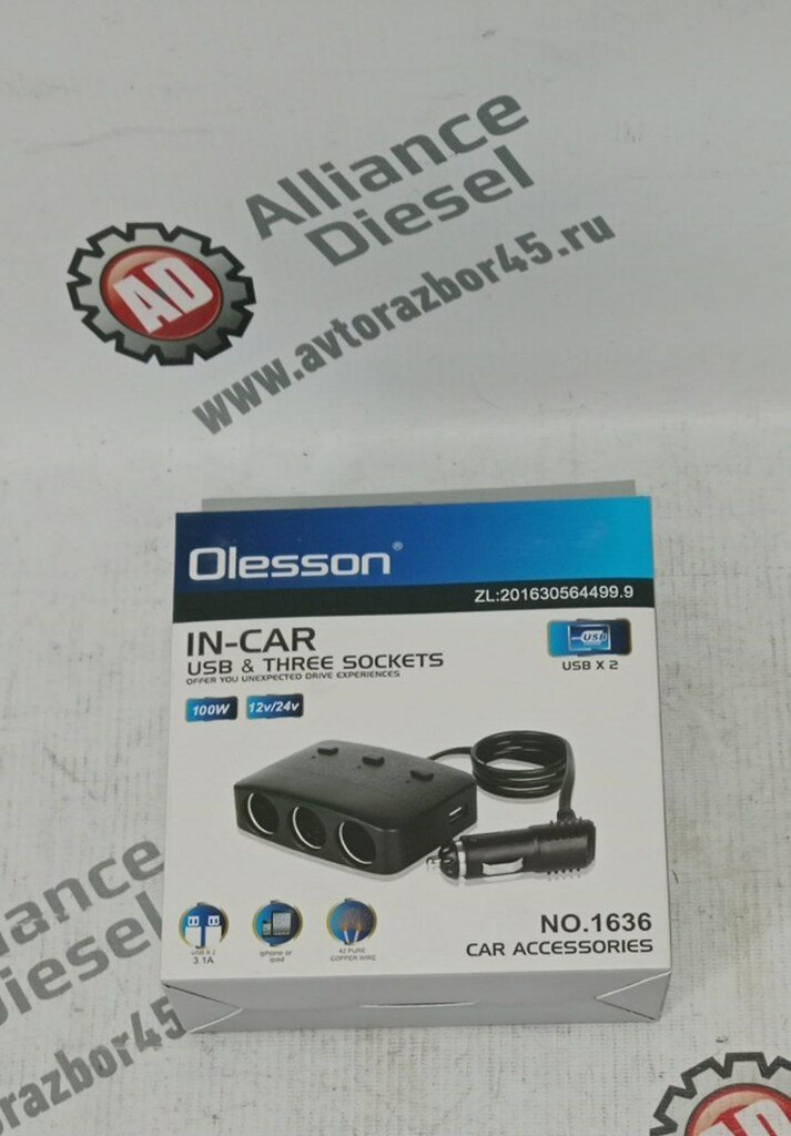 разветвитель прикуривателя авто OLESSON 1636 3 гнезда +USB нов. A794